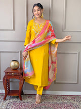 Rich Yellow Embroidered Viscose Fabric Straight Kurta, Pant And Dupatta Set