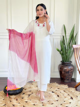 Elevate your festive wardrobe with this Sunshine White Chanderi Kurti Set, adorned with intricate embroidery work and paired with a stunning two-tone dupatta. Crafted from premium Chanderi fabric, the kurta features a flattering fit, ensuring both elegance and comfort. Perfect for festivals and special occasions, this ready-stock ensemble is available.
