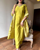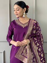 Introducing the most sought-after wedding season collection by Kuala Collection, featuring two stunning colors crafted in premium Silk (PV Chanderi) fabric. The top is adorned with exquisite embroidery, paired with matching pants and a luxurious Jacquard dupatta. Perfect for weddings, parties, and festive occasions, this collection is a must-have for ethnic wear enthusiasts in worldwide.