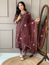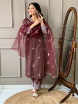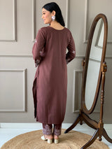Brown Slub Embroidered Kurti Set with Net Dupatta