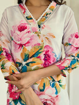 Enhance your ethnic wardrobe with this Floral Printed White Kurta Set, featuring a French Crepe top, Viscose Rayon trousers, and a lightweight Nazmeen dupatta. Perfect for Pongal celebrations, this elegant floral design is part of the Kuala Collection and is available at wholesale rates.