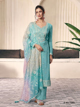 Paired with a beautiful Bemberg chiffon printed dupatta and a soft dull santoon bottom, this semi-stitched set offers both tradition and trend.