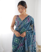 Artisanal Elegance Bandhani Saree in Teal with Multicolor Geometric Motifs
