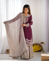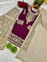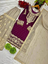 Elevate your ethnic wardrobe with our premium designer 3-piece suit set featuring exquisite embroidery and luxe embellishments. Crafted from heavy faux georgette, this ready-to-wear ensemble is ideal for festive occasions and special events. Fully stitched and available in extended sizes, it offers unmatched comfort, elegance, and durability—perfect for retail or bulk orders.